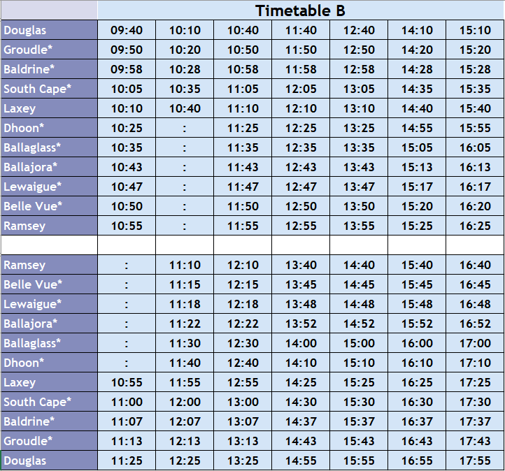 Intermediate stops are by request other than Laxey.To alight at a request stop, inform the conductor which one you would like on boarding.To board, give a clear hand signal to the driver.