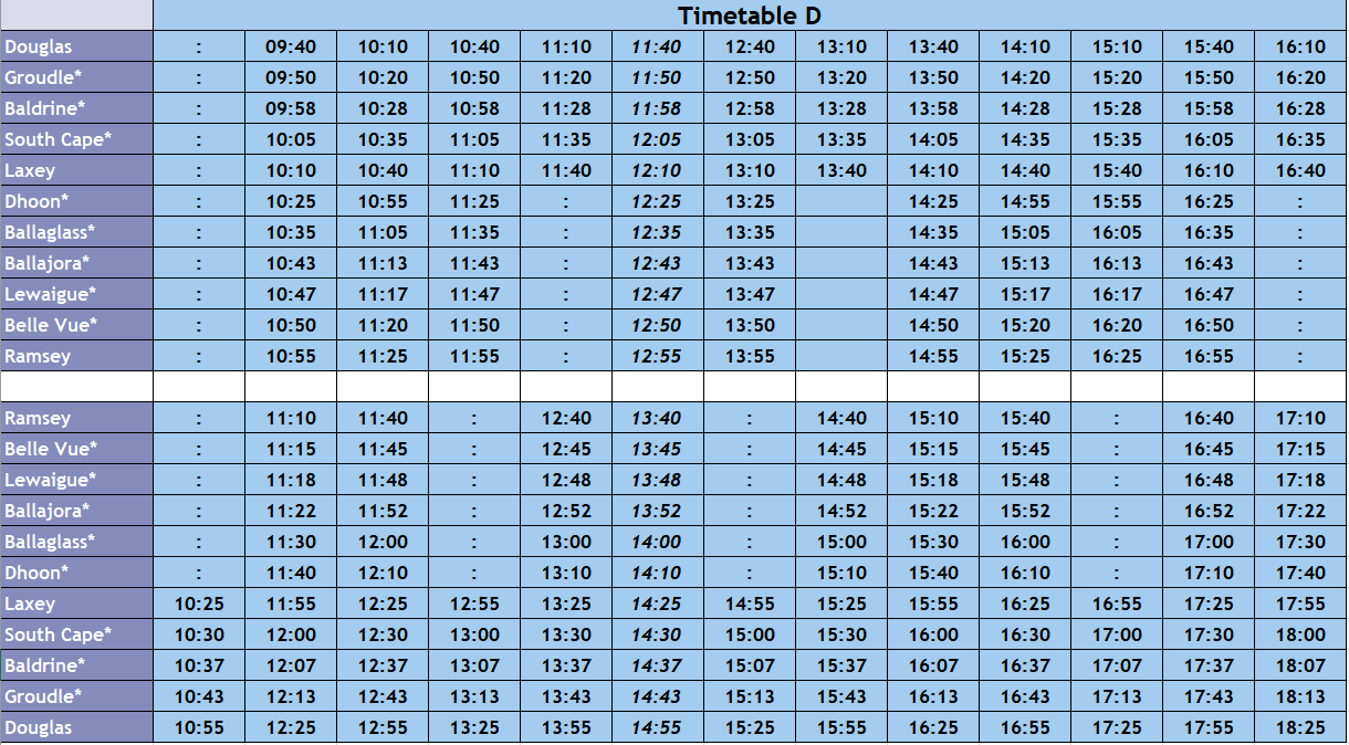 Please note that on 9th August 2025, the 10:40 departure from Derby Castle will terminate at Laxey at 11:10 and the 12:40 departure from Ramsey will commence at Laxey at 13:25.