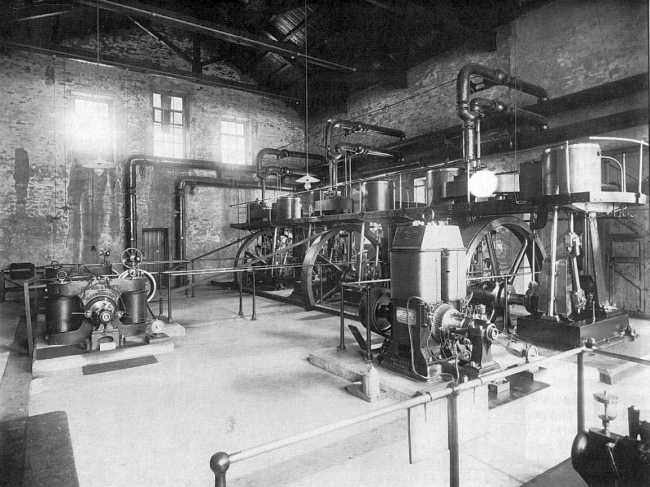 The interior of the-then engine house in Summer 1894, looking towards the east wall. In the background are the two original 1893 Galloway engines and Mather and Platt dynamos, with the 1894 Galloway and Hopkinson dynamo in the foreground. © Mather and Platt