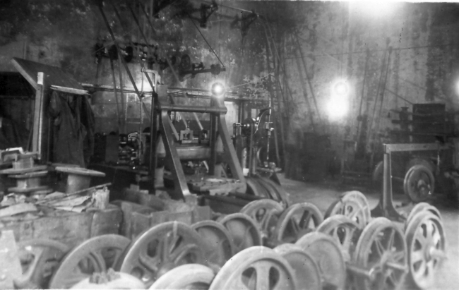 The interior of the Machine Shop in 1922, looking towards the north wall. The pulley system for driving equipment is visible above. © iMuseum