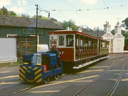 Simplex No.22021 in operation with Trailers 37 and 49 between Laxey and Minorca in 1996 (the only known passenger workings of the now-Port Erin shunter!) © http://www.mer.im
