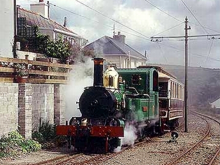 IOMR No.1 ‘Sutherland’ and Trailer No.58 arrive at Fairy Cottage with a service from Laxey. © http://www.mer.im