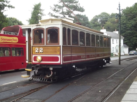 Car No.22 was used single-motor during the afternoon, here pictured alongside the Manx Sightseeing open-top bus. © Josh Haworth