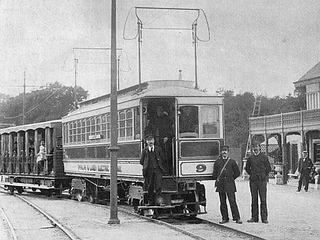 Car No.9 in original condition at Groudle Glen during the mid-1890s, still fitted with bow-collectors, and the staff posing for a quick photo-call! © Website Collection