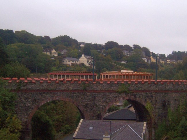 Car No.9 and Trailer No.46 pass over the Glen Roy Viaduct bound for Derby Castle. © David Martin