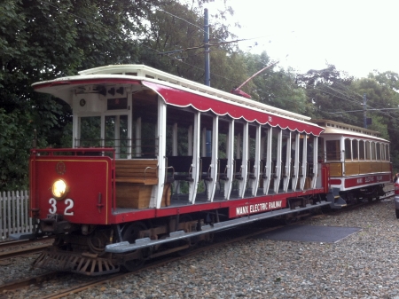 Car No.32/Trailer No.58 after arrival at Laxey Car Shed with the 1640 ex-Derby Castle. © Alex Fairlie