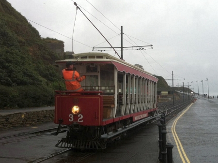Car No.32 was brought back from Laxey to Derby Castle Car Sheds by the Overhead Line gang early on Friday morning. © David Martin