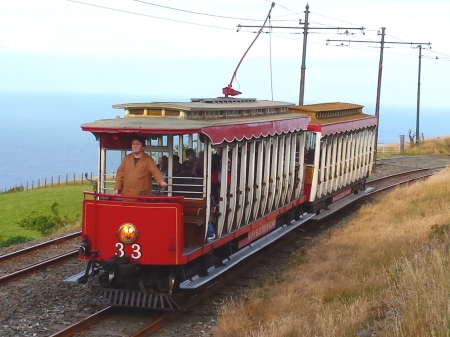 Car No.33 and Trailer No.46 pose for photographers at Bulgham Head on the first of the Electrifying Evening runs. Note the original M.E.R headlamp, carried on the front of cars until the late 1970s. © Chris Rowe