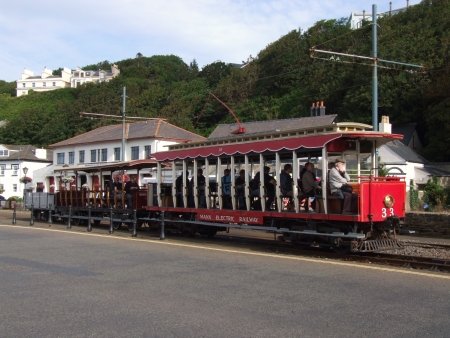The unusual combination of Car No.33, Trailer No.51 and Wagon No.8 wait to leave Derby Castle for Laxey on a 08:55 special. © David Hennessey