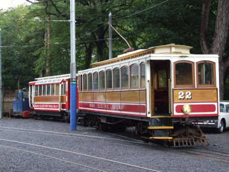 Car No.22 waits to take up its Motorman Taster Sessions while Trailer No.56, Van No.4 and LM344 ‘Pig’ are on display in the Laxey Station Siding. © David Hennessey