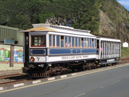 Car No.7 and Trailer No.48 drift past the Car Sheds at Derby Castle with a southbound service.© David Hennessey
