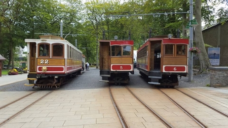 Car No.22/Trailer No.40 wait at Laxey alongside Snaefell No.5 and No.6. © Robert Purcell