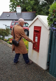 A ‘conductor’ poses unlocking the mailbox at Baldrine, to collect the mail for onward transport to Derby Castle. © Robert Purcell