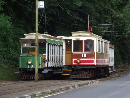 Car No.19/Trailer No.43 pass Car No.16/Trailer No.58 at Groudle while working the 09:55 Laxey-Derby Castle. The latter had just terminated and was waiting to proceed to Derby Castle. © David Hennessey.