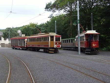After shunting at Laxey Car No.1/Trailer No.60 stabled in the Station Siding – Car No.6 and Trailer No.44 pass by with a Derby Castle bound service. © David Hennessey