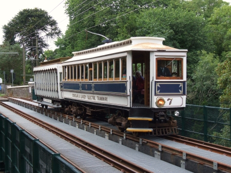 Car No.7/Trailer No.48 pause for a photo-stop on Ballure Bridge, whilst working the return Isle of Man 50 Group private hire to Derby Castle. © David Hennessey