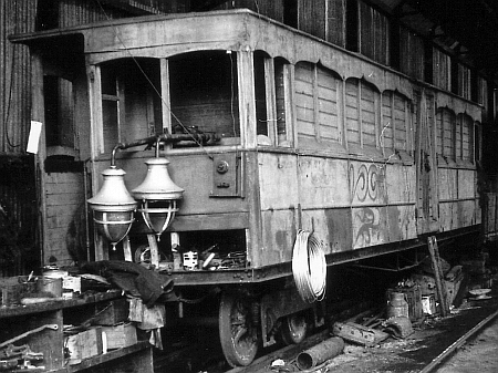 Car No.10 in converted condition (Freight Trailer No.26) in store in Laxey Car Shed during the 1970s, after the toll of storage had taken place. © Travel Lens Photographic