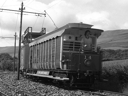 After withdrawl from passenger service, No.14 saw several years use with the Poles and Wires department undertaking works duties. No.14 is seen here with Tower Wagons 10 and 12 in tow between Ballaglass and Cornaa on the 9th August 1979. © Colin Clifton
