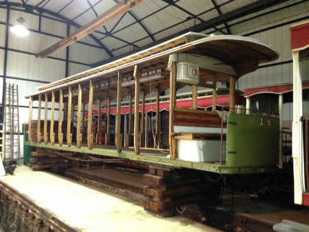 In November 2016 the trucks from Car No.14 were removed to have their motors overhauled. Here the Car stands on bricks awaiting the replacement of its trucks. © David Martin