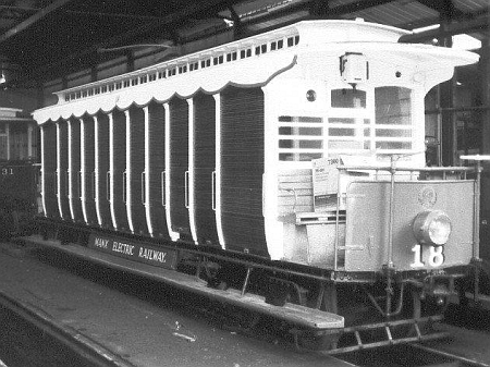 Car No.18, post 1987/88 repaint during 1992 undergoing rectification to return to traffic in the Derby Castle Bottom Shed. © Alan Spencer