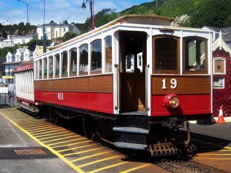 Car No.19 at Derby Castle with a northbound service in August 2008, with a modified austerity livery, now carrying white M.E.R lettering on the lower panel. © David Martin
