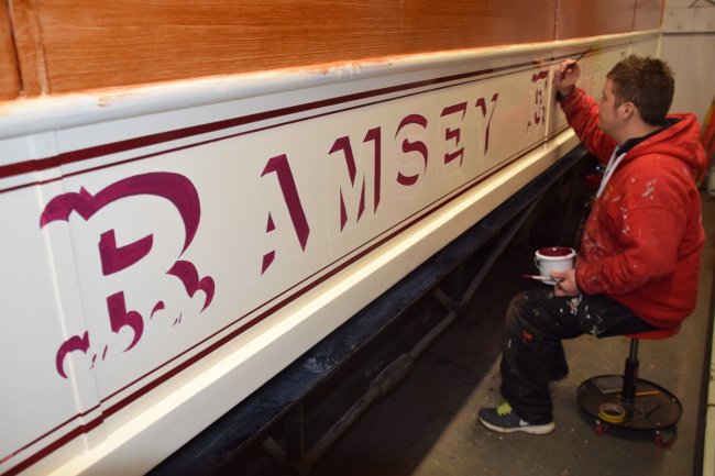 Undercoating the shading of the 1899 style lettering on Car 19. © Andrew Scarffe