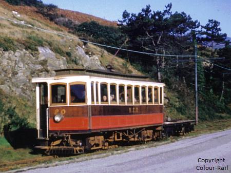 Car No.20 climbing to Howstrake with Trailer No.52 (presumably back to Derby Castle for repair or further permanent way use) during the Early-Mid 1950s. © Colour-Rail