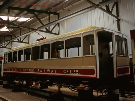 From Summer 1997 to Spring 1999, Car No.20 was given a full overhaul to body (including a repaint) and trucks, pictured here in the Top Sheds at Derby Castle during July 1998, raised on jacks and barrels. © http://www.mer.im