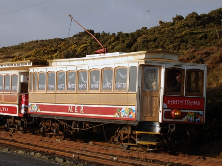 Car No.20 wearing ‘Santa Tram’ embellishments passes Lag Birragh while en-route to Laxey, hauling Trailer No.57. © David Kelly