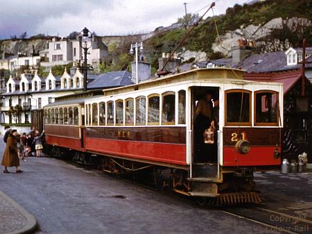 Car No.21 awaiting departure northbound at Derby Castle during April 1957, with Trailer No.57 and Van No.16. © Colour-Rail