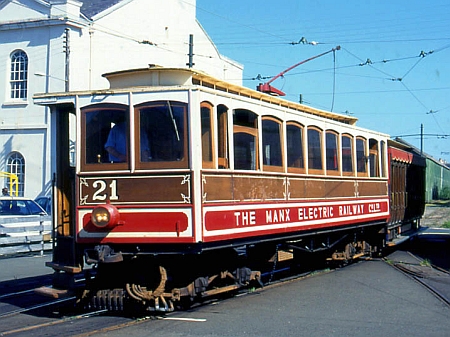 Car No.21 was repainted into the full 1930s livery post-overhaul, intended to match Car No.19, No.20 and No.21, pictured here arriving at Ramsey with Trailer No.48 during 1996. © Rob McCaffery