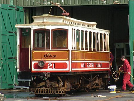 By 2006, No21 had gained a repaint into a faux-1930s livery, with simplified lining and ‘Isle of Man Transport’ branding on both The Car is seen being washed at Derby Castle Car Sheds. © Jon Wornham