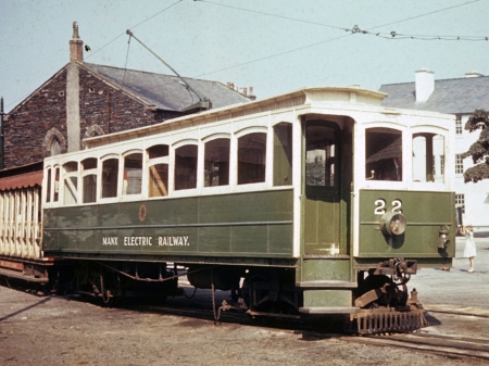 Car No.22 in the short-lived ‘Nationalisation’ Green livery awaiting departure to Derby Castle at Ramsey during 1958-59. © http://www.mer.im