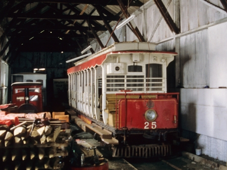 Car No.25 inside Ramsey Car Shed during May 1996 alongside the Ramsey Pier Locomotive and Trailer, Freight Trailer No.26 and Van No.14. © http://www.mer.im
