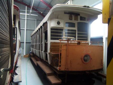 Car No.25, seen in storage at Laxey Car Shed during July 2010, raised on wooden sleepers. © David Martin