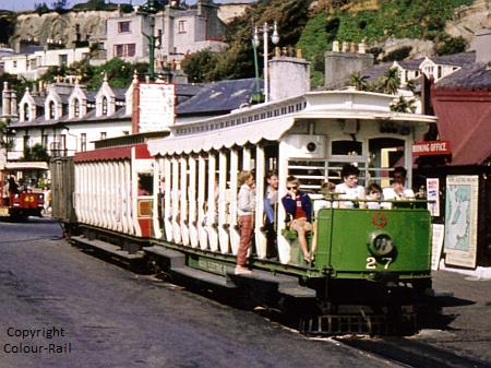 Car No.27 in ‘Nationalised Green’ waits departure at Derby Castle during August 1959, hauling either Trailer 42 or 43 with Van No.16. © Colour-Rail