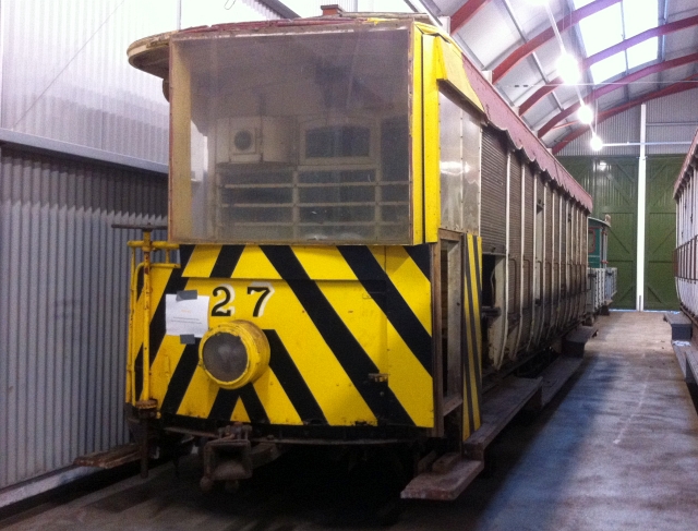 Car No.27 was moved from Road 1 of Laxey Car Shed during October 2014 across to the former Road 4, and raised on wooden sleepers. © Alex Fairlie