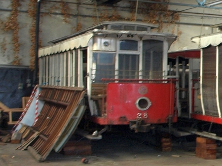 Car No.28 was moved from storage at Laxey Car Shed to Homefield Bus Garage, Upper Douglas during 2002. It is seen here awaiting removal during late 2009, with the roof from Trailer No.45 leaning against it! © Fred Quaye