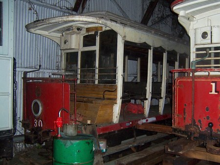 Following the return of several items of rolling stock from Homefield Bus Depot in 2009 and 2010, Car No.30 has been surrounded by several other stored vehicles at the rear of Ramsey Car Shed. The Car is seen here between Freight Trailer No.26 and Ratchet Car No.14. © David Martin