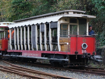 With the impending demolition of Ramsey Car Shed, Car No.30 was moved by road to Laxey on the 4th of November, pictured here being pushed inside Laxey Car Shed for further storage. © Joseph Rock