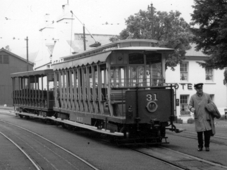 Car No.31 waits with Trailer No.60 and the motorman to drop down to the station loading area at Laxey on the 13th of July 1965. © J Copland
