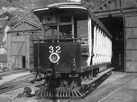 Car No.32 waiting for use outside Derby Castle Car Sheds in 1946, sporting a transition livery, carrying the unlined red dashes and valance, but with the full ‘The Manx Electric Railway Co Ltd.’ company title. © Website Collection