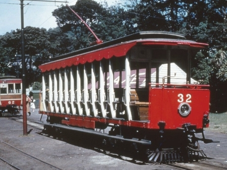 Car No.32 pauses at Laxey during 1957 whilst Trailer No.62 is gravity shunted towards it. It is wearing ‘Austerity’ style livery, with no lettering. © Alan Spencer Collection