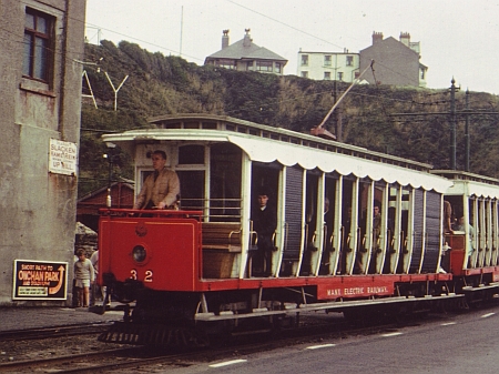 Car No.32 is seen near the end of it’s journey passing the Derby Castle Car Sheds complex. By this time it had repainted into the normal Red colour (alongside No.62 again), but retained the white valance. © Travel Lens Photographic.