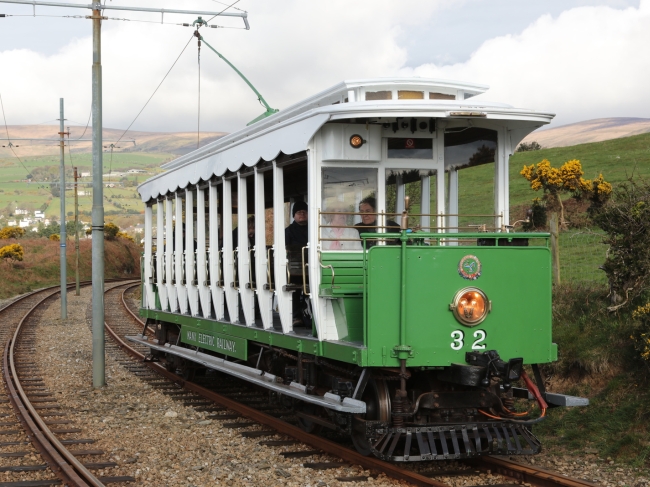 Car No.32 stands at Bonner Corner for a photo-stop on the 14th of April 2017, working a special 09:10 Derby Castle-Ramsey service as part of the 2017 Rush Hour event. © Colin Clifton