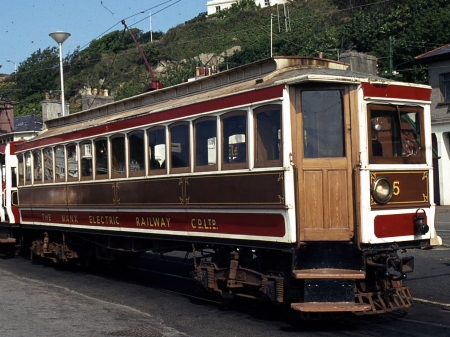 By 1984 Car No.5 had regained more of a traditional look, with a return to the 1930’s livery and removal of the second headlight, here waiting for service at Derby Castle. © Richard Lomas