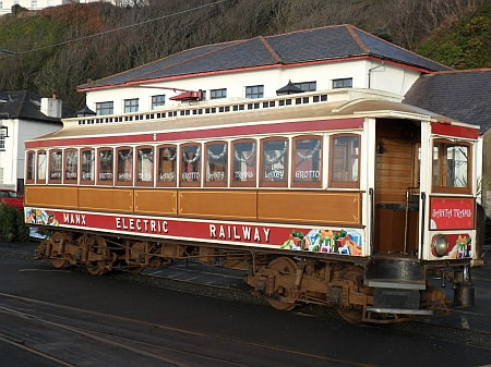 Car No.6 in ‘Santa Tram’ guise stabled in the Derby Castle Groudle Siding during December 2012. © David Martin