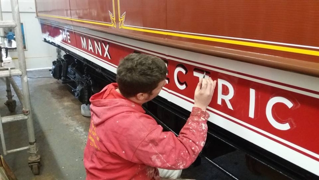 Black shading being applied to the bodyside lettering of Car No.6 on the 19th of March. © Manx Electric Railway Museum