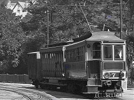 Car No.7 at Laxey during the mid/late 1930s, wearing the full ‘The Manx Electric Railway Co Ltd’ title. © Travel Lens Photographic