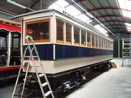 The long-due overhaul of Car No.7 was started in 2007, and the Car left the M.E.R for a full body overhaul in 2009. It returned in 2010 and is seen here in July of that year undergoing it’s repaint into original Douglas and Laxey livery. © David Martin
